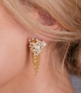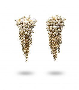A chevron of fine chains is encrusted with freshwater pearls in Kate’s signature organic, textural style. These would make fabulous bridal earrings, or wear them to add an unusual feminine twist to your look.