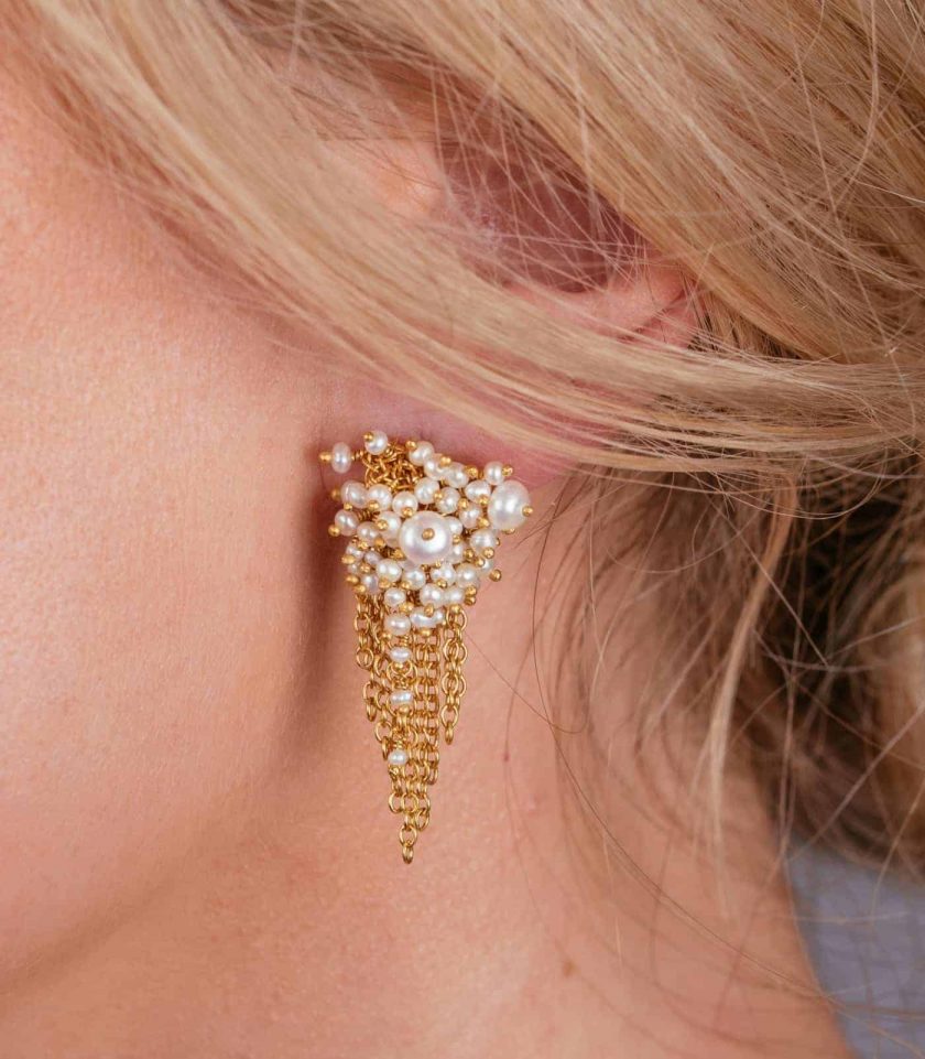 An unusual pair of pearl tassel earrings. These have a stud (post) fitting and sit close against the ear.