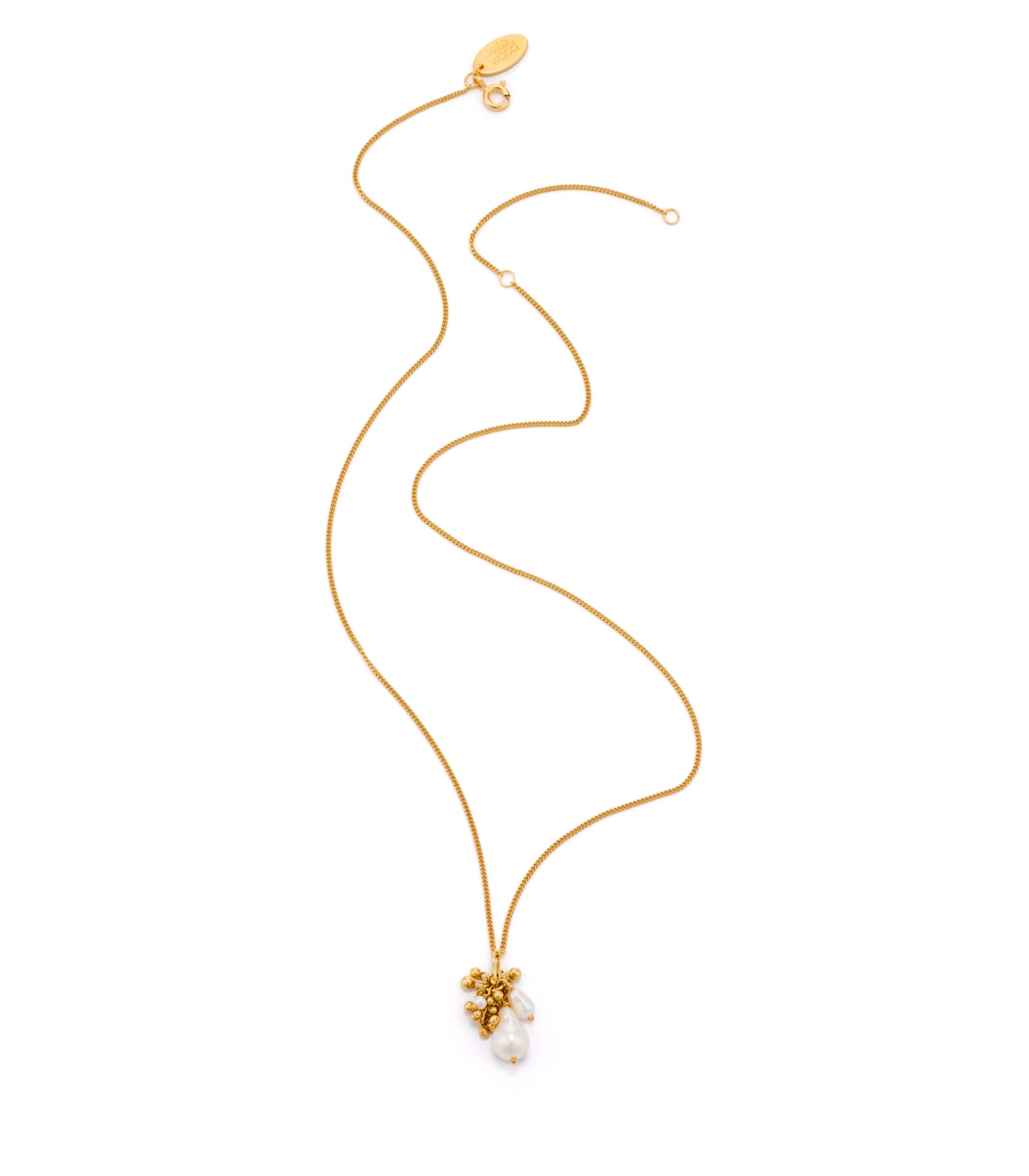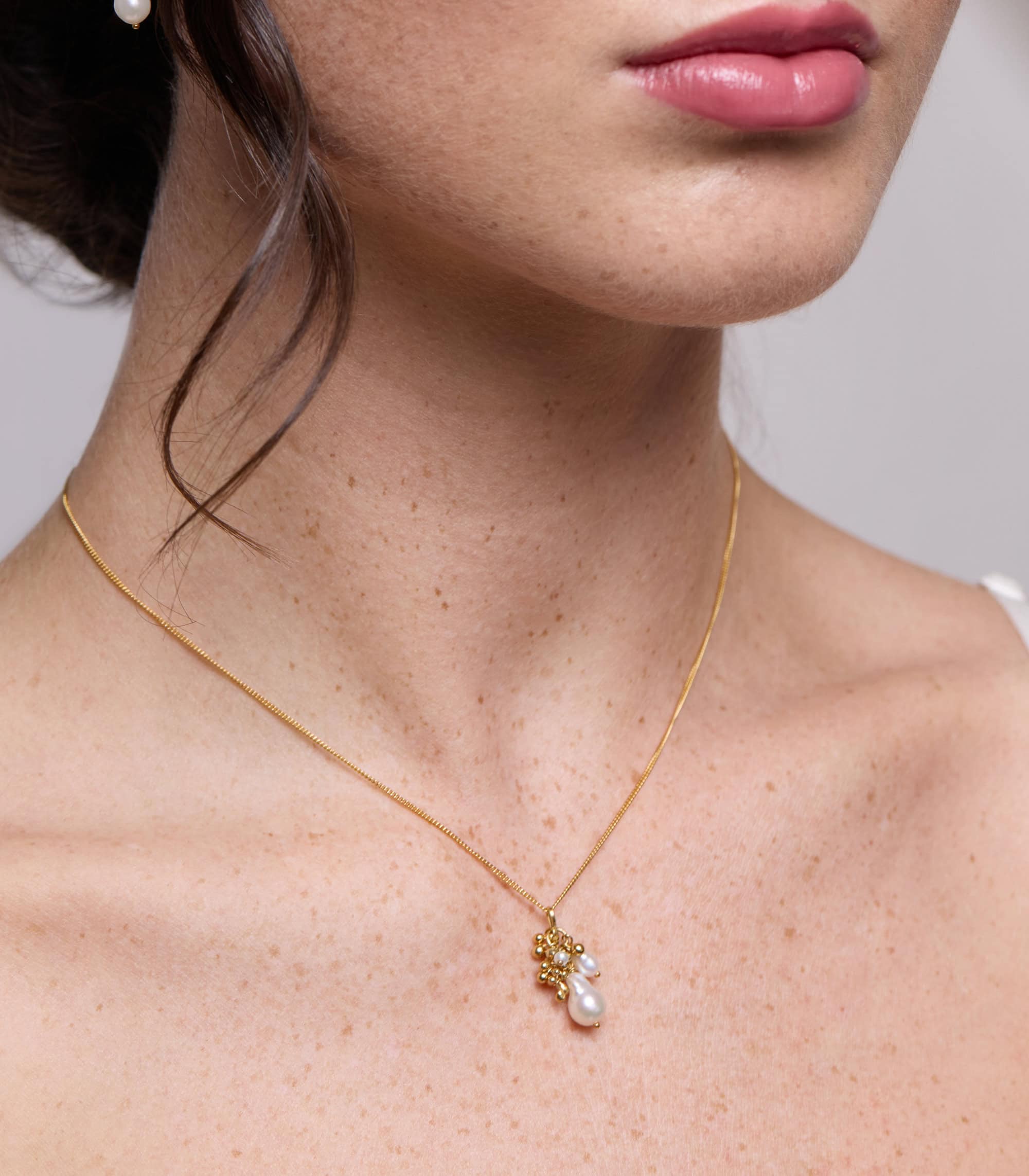 A pearl pendant necklace featuring a baroque pearl droplet, accented with a cluster of gold vermeil droplets. Two smaller pearls complete the composition – a 4mm drop, and a 2 mm button shaped bead.