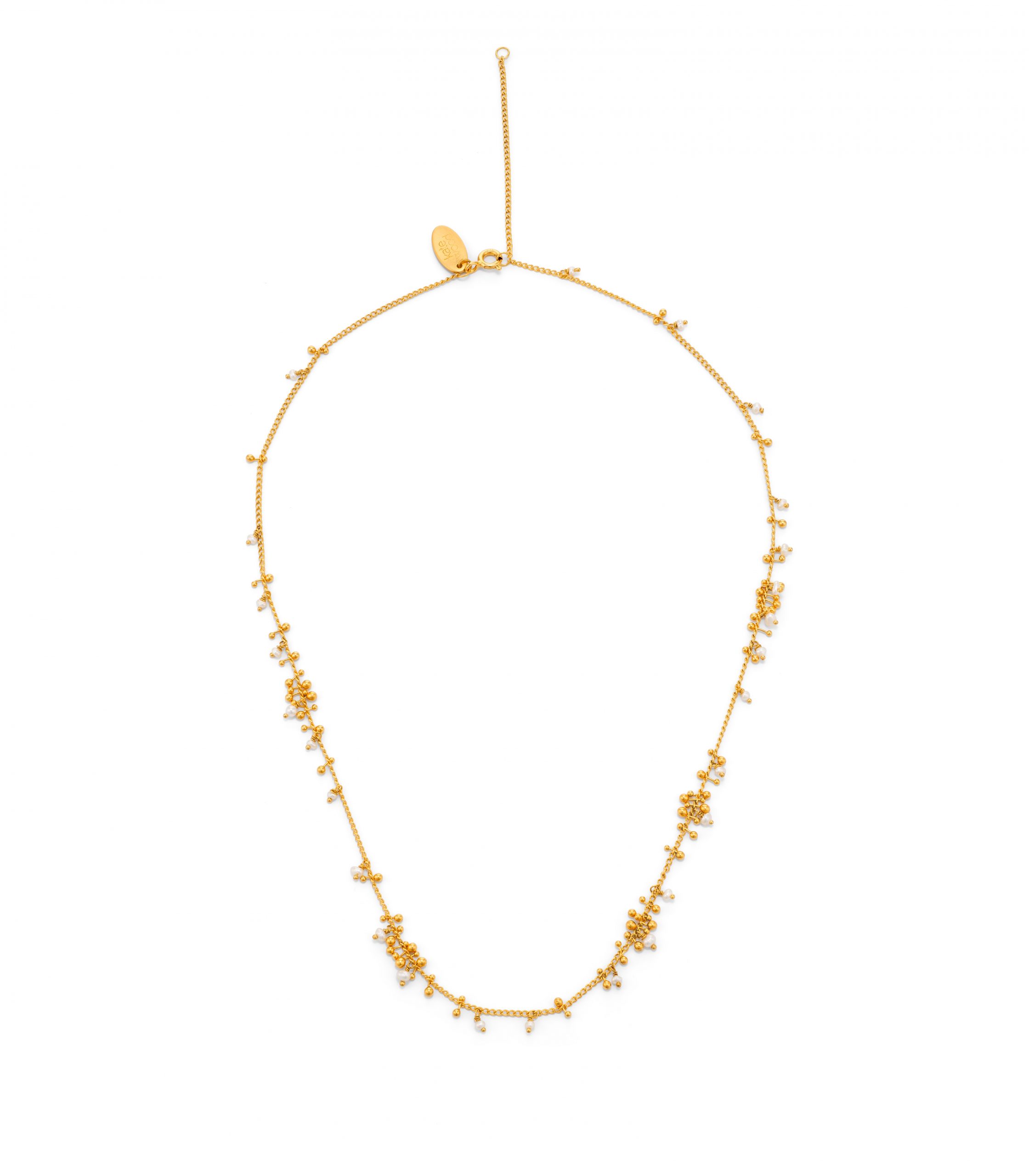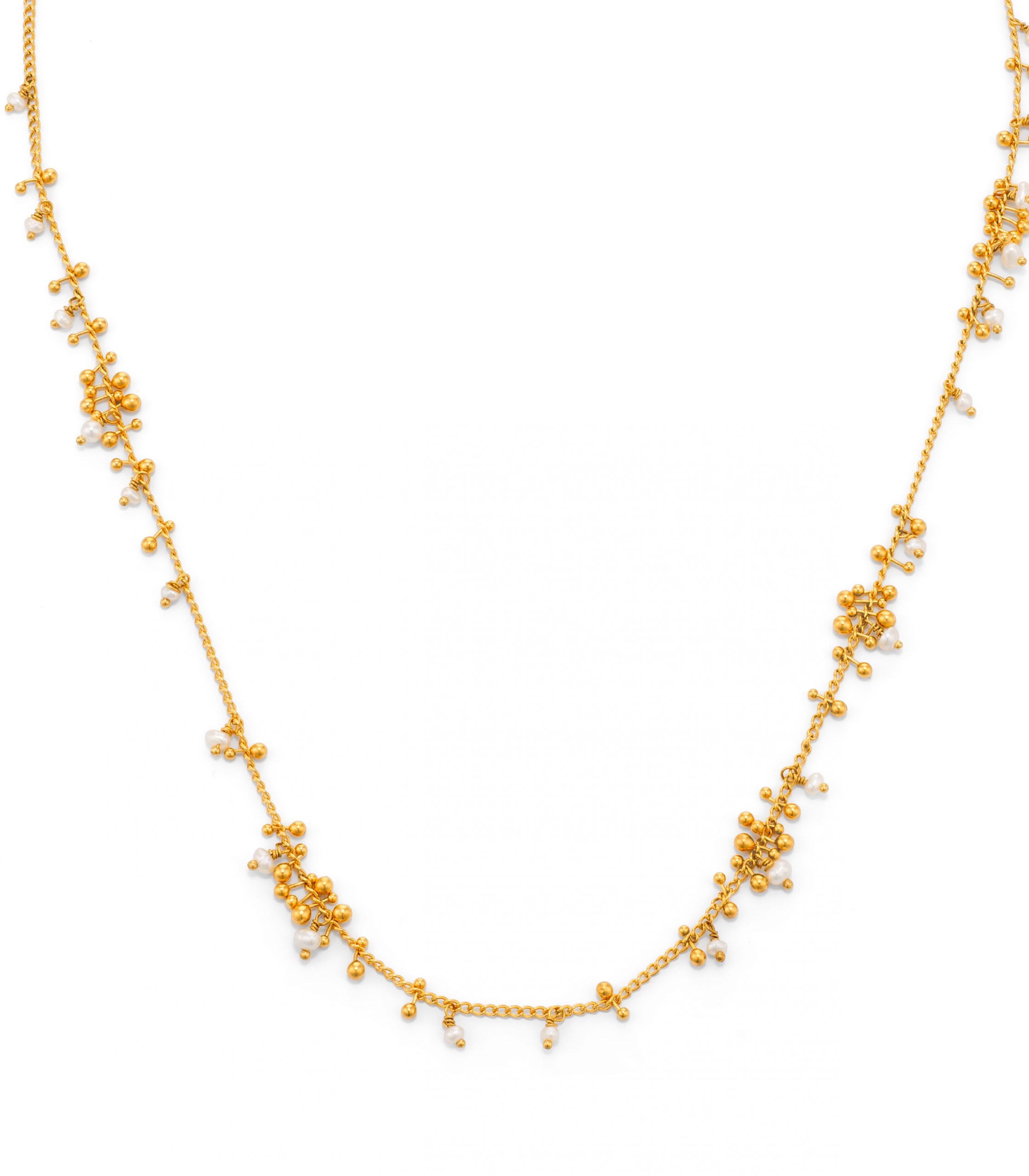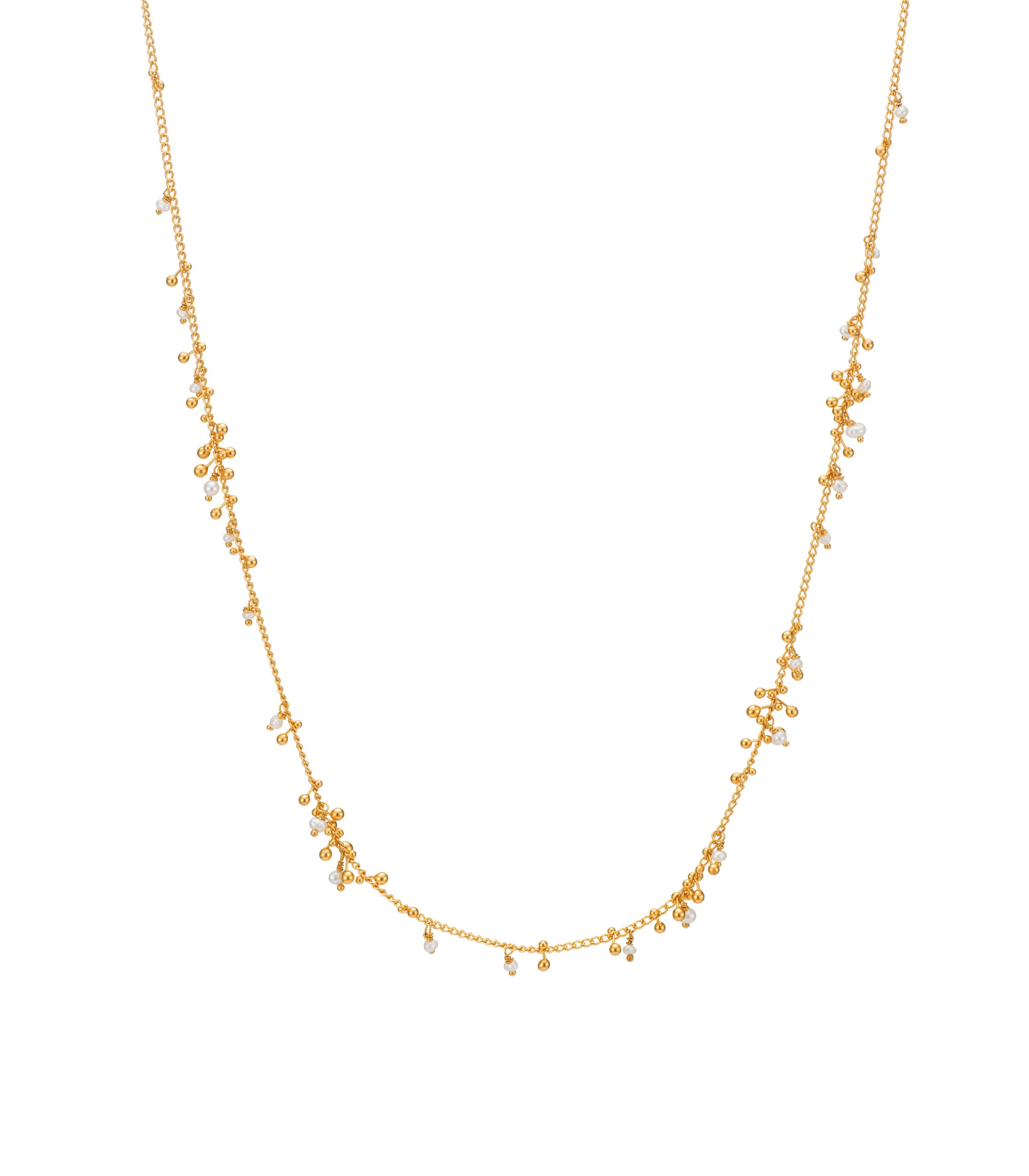 Each golden droplet is individually formed by hand in sterling silver using a torch flame. The droplets are then finished with a thick layer of gold plating, adding warmth and subtle luxury to the design. Interspersed with luminous pearls, the necklace feels timeless yet contemporary.