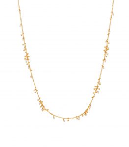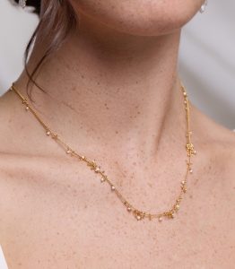 A delicate pearl necklace adorned with scattered golden droplets, designed to catch the light with every movement. Effortlessly elegant, this piece is perfect for layering with your favourite chains or wearing alone for a minimal, romantic statement.