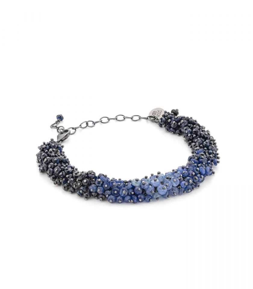 This luxurious bracelet is entirely hand-beaded, with shaded blue sapphire beads arranged in a gradient of blue tones for a subtle ombré effect. A backdrop of oxidised silver lets the varying tones of these natural sapphire beads really sing.