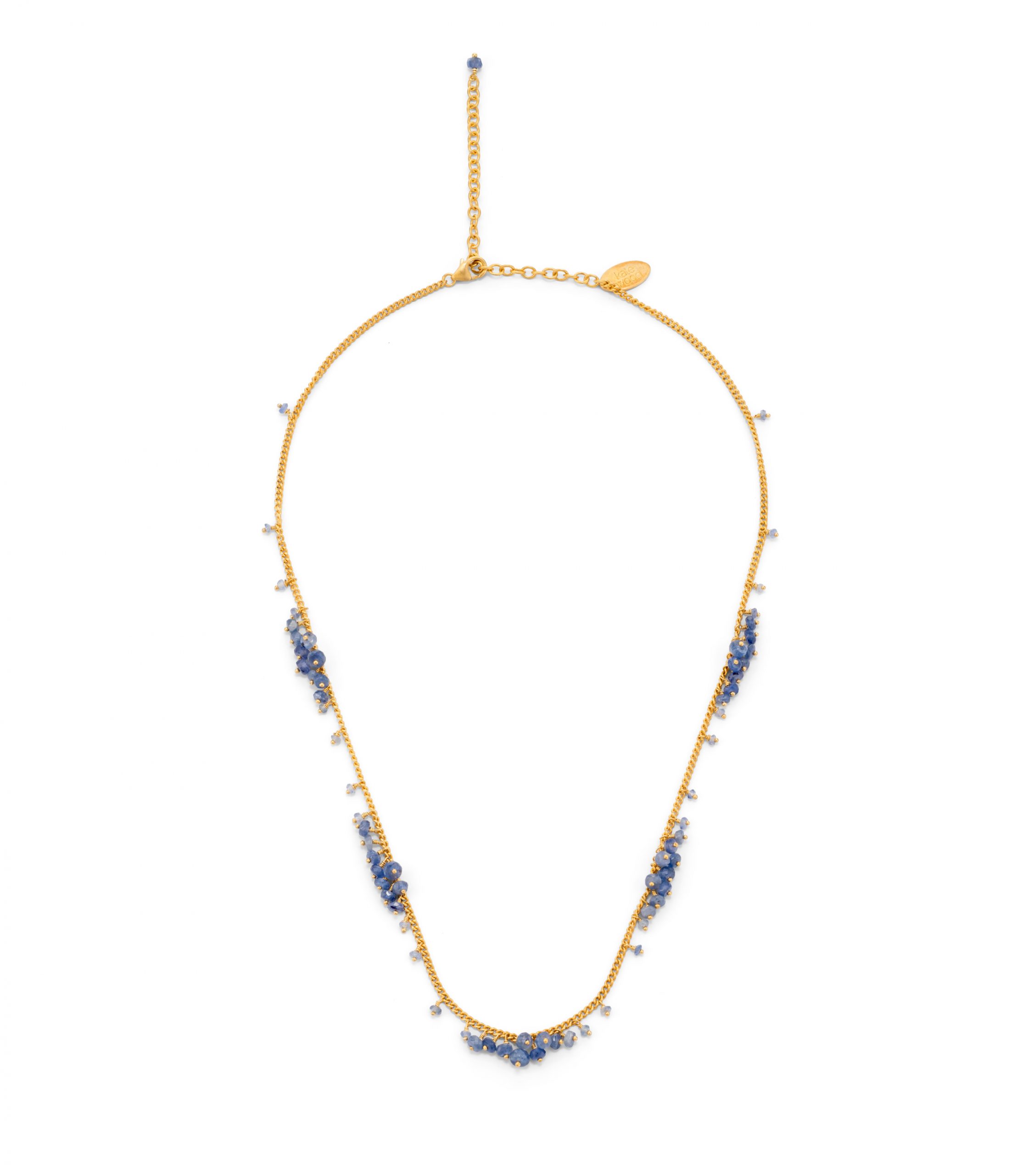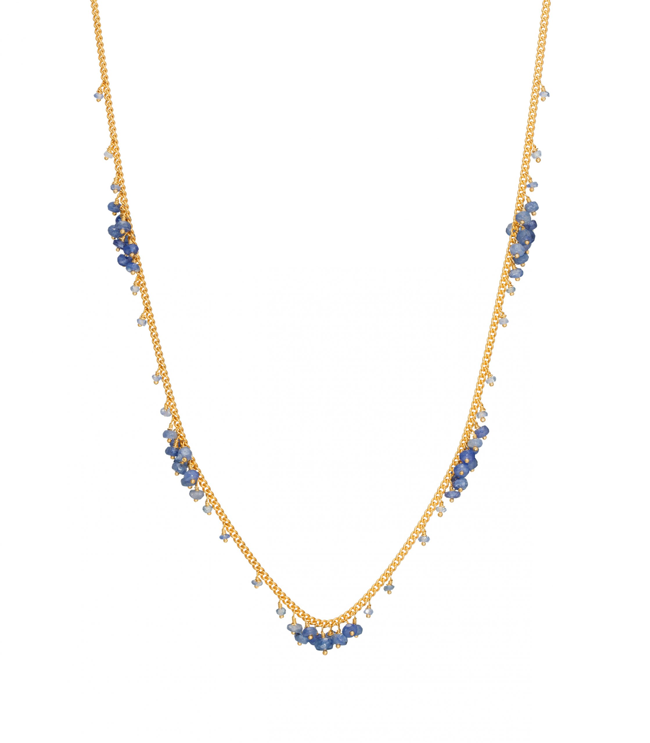 A pretty and classic blue sapphire necklace. Five clusters of blue sapphire beads are pinned along buttery yellow gold vermeil curb chain with scatterings of little sapphires in between. The overall effect is natural and effortlessly light.