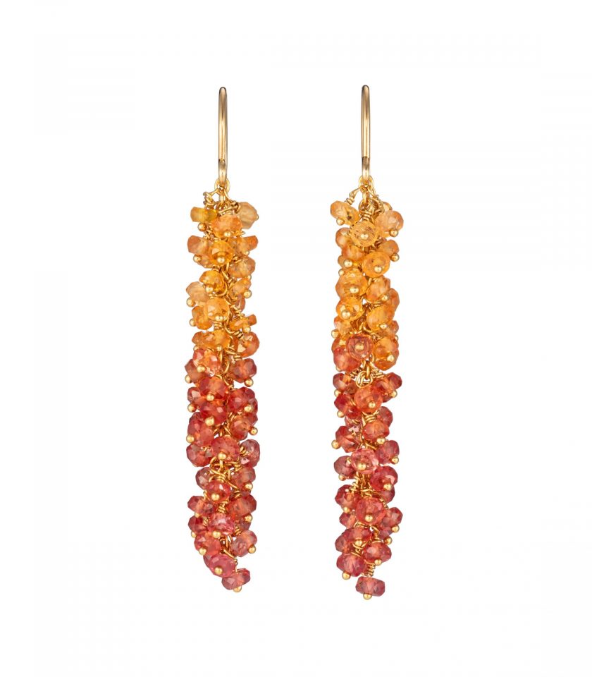 Graduating from a vibrant bright orange to a deeper burnt orange hue, these stunning, vibrant drop earrings are sure to attract compliments. Each faceted sapphire bead is meticulously wire-wrapped and moves individually, lending these column earrings a supple movement.