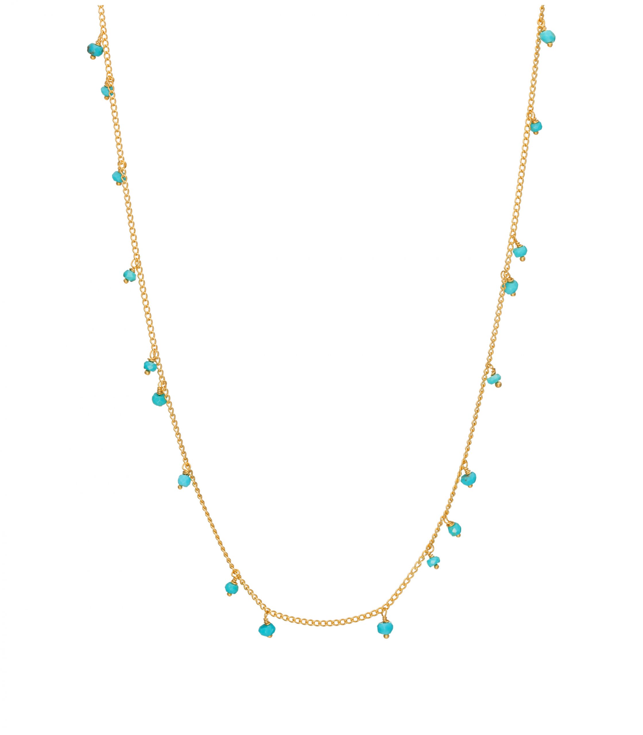 This turquoise beaded necklace features beautiful, genuine Arizona turquoise beads, delicately scattered along a fine gold-plated sterling silver curb chain. Each bead is individually hand-wrapped and arranged with care for an effortless, natural effect.